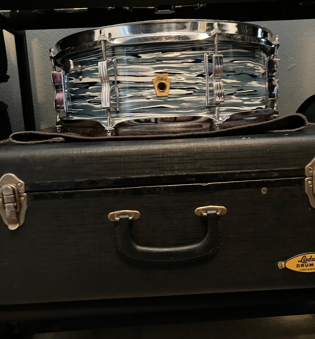 Purchased at the 2024 Chicago Drum Show, this is one of the newest additions to my collection. A nice, original condition snare in a beautiful finish. My first drum set was also blue sparkle. I am starting to develop a fondness for mid-60’s Ludwig sparkle wrapped Pioneer snares.